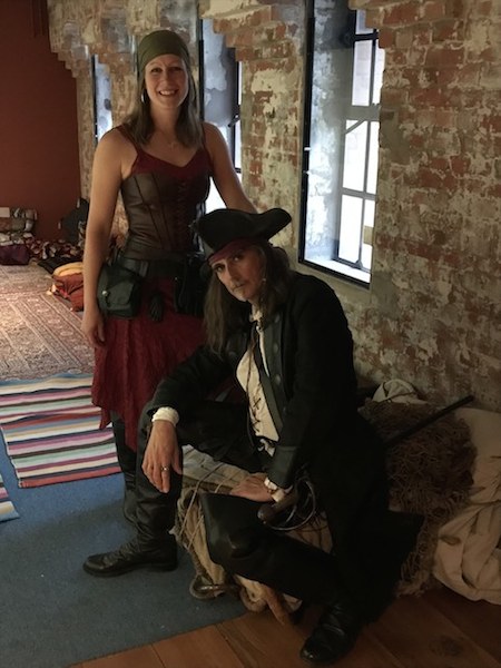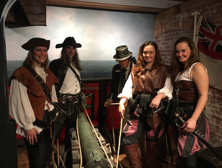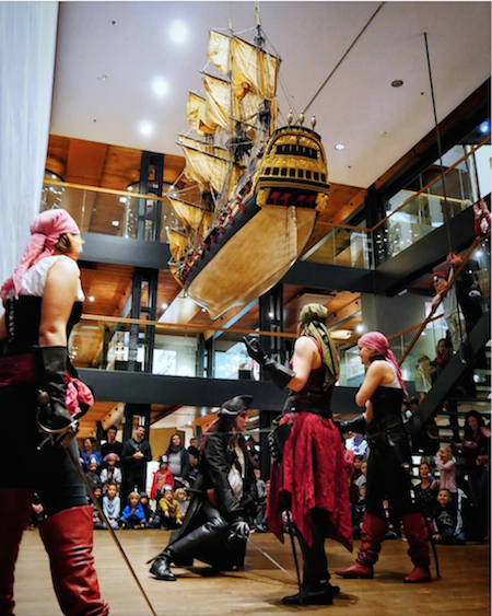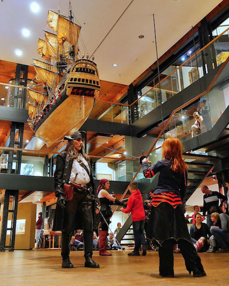geschlagen und werden heute noch als Volkshelden gefeiert. Als Parallele zu der grausamen Geschichte der USA, die einen Kontinent von seinen indianischen Ur-Einwohnern befreite und darüber heute heldenhafte, sogar lustige Western auf die Leinwand bringt, wird auch die Piraterie kindgerecht verpackt und romantisch zum Abenteuertum umfunktioniert. Lassen wir uns dennoch entführen in die Piratenwelt und denken über Gerechtigkeit und Menschlichkeit in diesem Rollenspiel nach. In jedem Fall werden die „Guten“ siegen... ![]() Stolzer Pirat mit Piratentochter... Stets beliebt: Der Familiensonntag im Internationalen Museum Hamburg: "Piraten Ahoi!" ![]() Die Piraten-Crew (Photo IMMH) ![]() Chancenloser Kampf gegen drei Piratenbräute... (Photo IMMH) ![]() Fechtlektionen für junge Piraten. (Photo IMMH) |